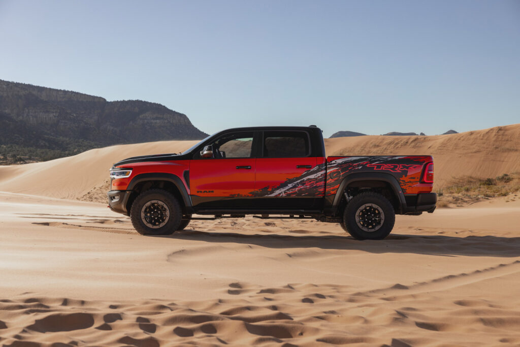 Deze indrukwekkende cijfers maken de nieuwe TRX dus ook de meest krachtige pick-up ooit gebouwd. Ten opzichte van de vorige TRX heeft deze dus 75 PK extra. Dat hebben we te danken aan de motorupgrades die SRT heeft uitgevoerd. Vandaar de naam RAM 1500 SRT TRX. Volgens de cijfers van RAM moet deze TRX in 3,5 seconde zijn sprint maken van 0 naar 100 km/u.